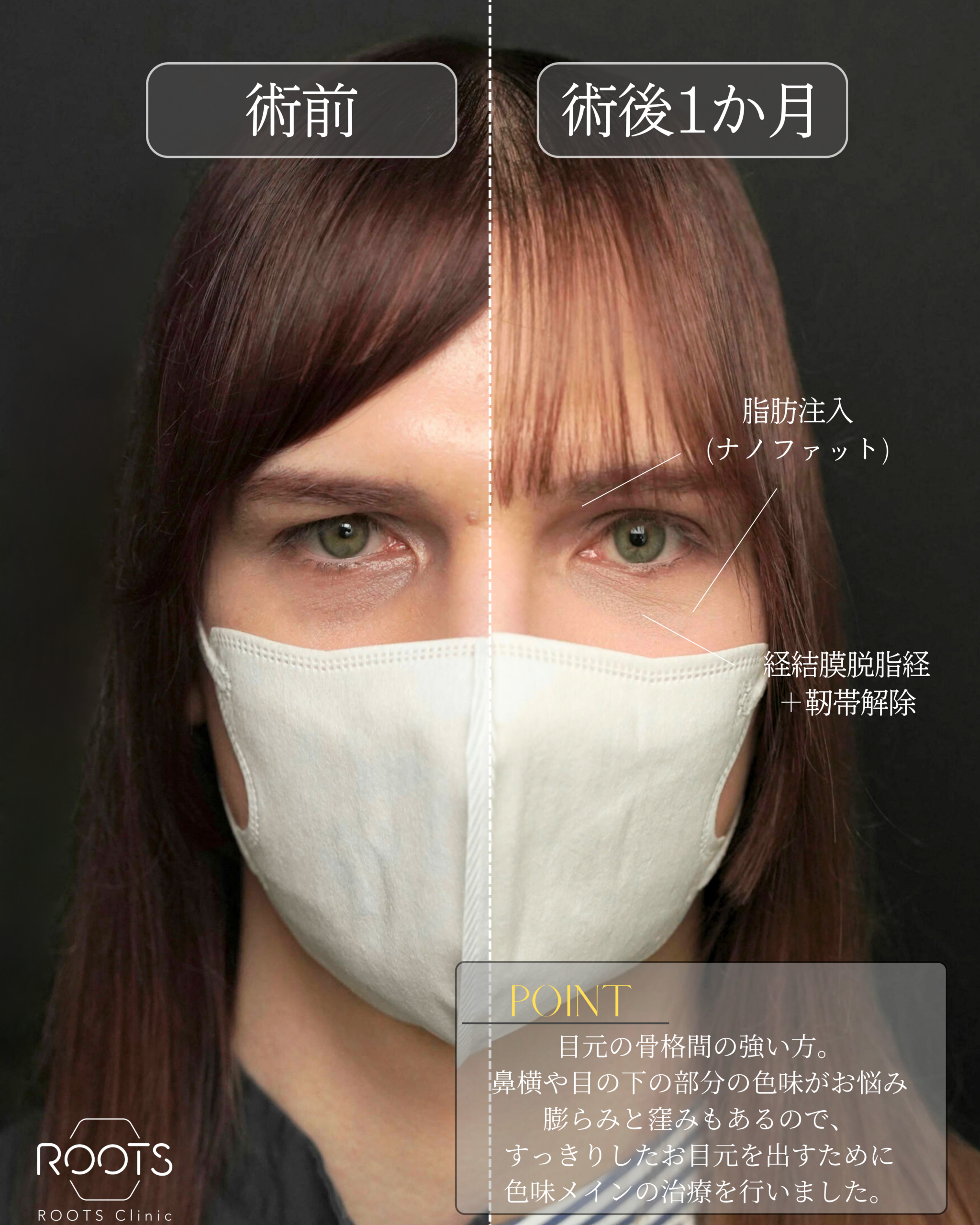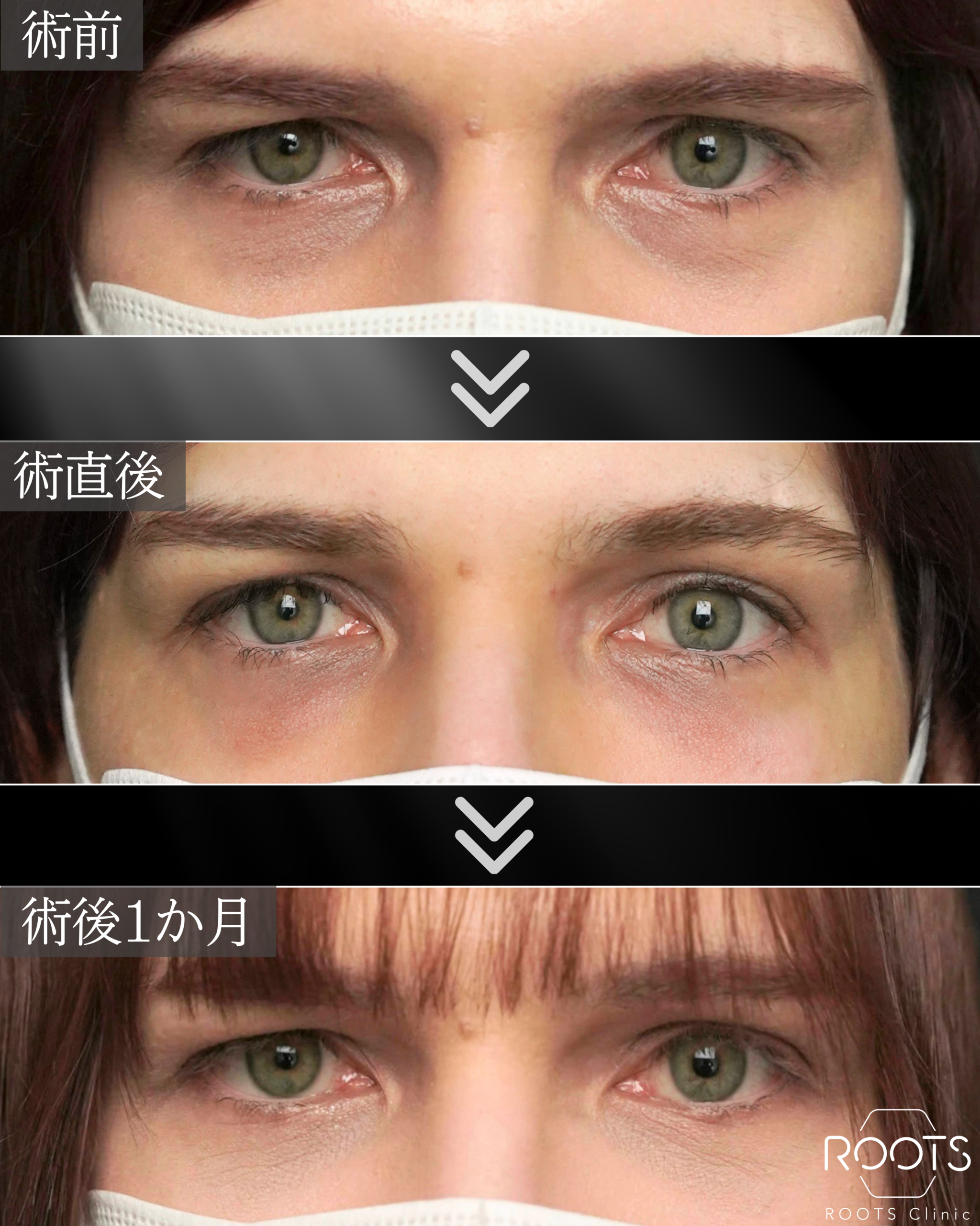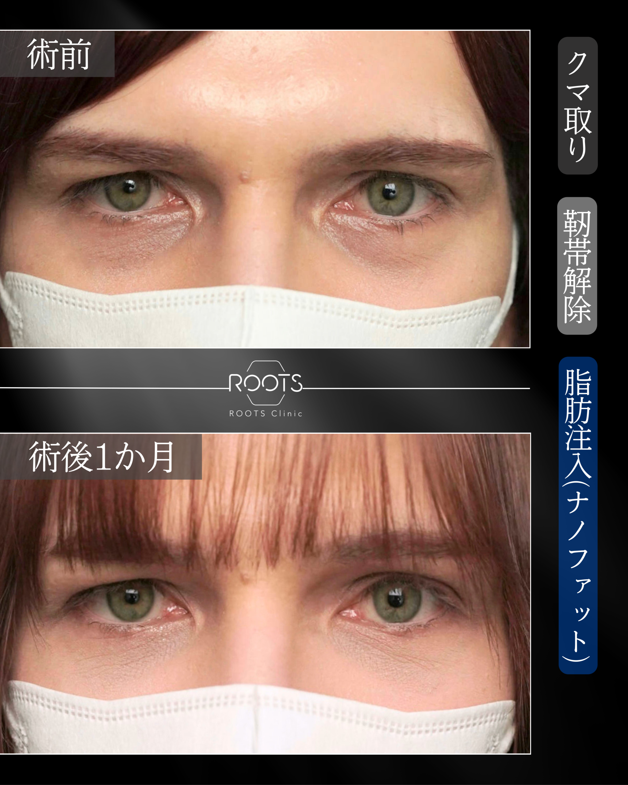 | リスク・副作用 | 1週間程度:むくみ・下まぶたの内出血・目の充血・目ヤニ・目元の凹み、ごろつき、血の涙 2週間程度:目元を抑えた際の痛み、内出血が吸収された後の黄ばみ 1か月:左右差、凹み、目の下の小じわ、たるみ、感染・やけど、瘢痕、下まぶたに傷、一時的なたれ目、まつげの内反症などの症状が現れる場合があります。 |